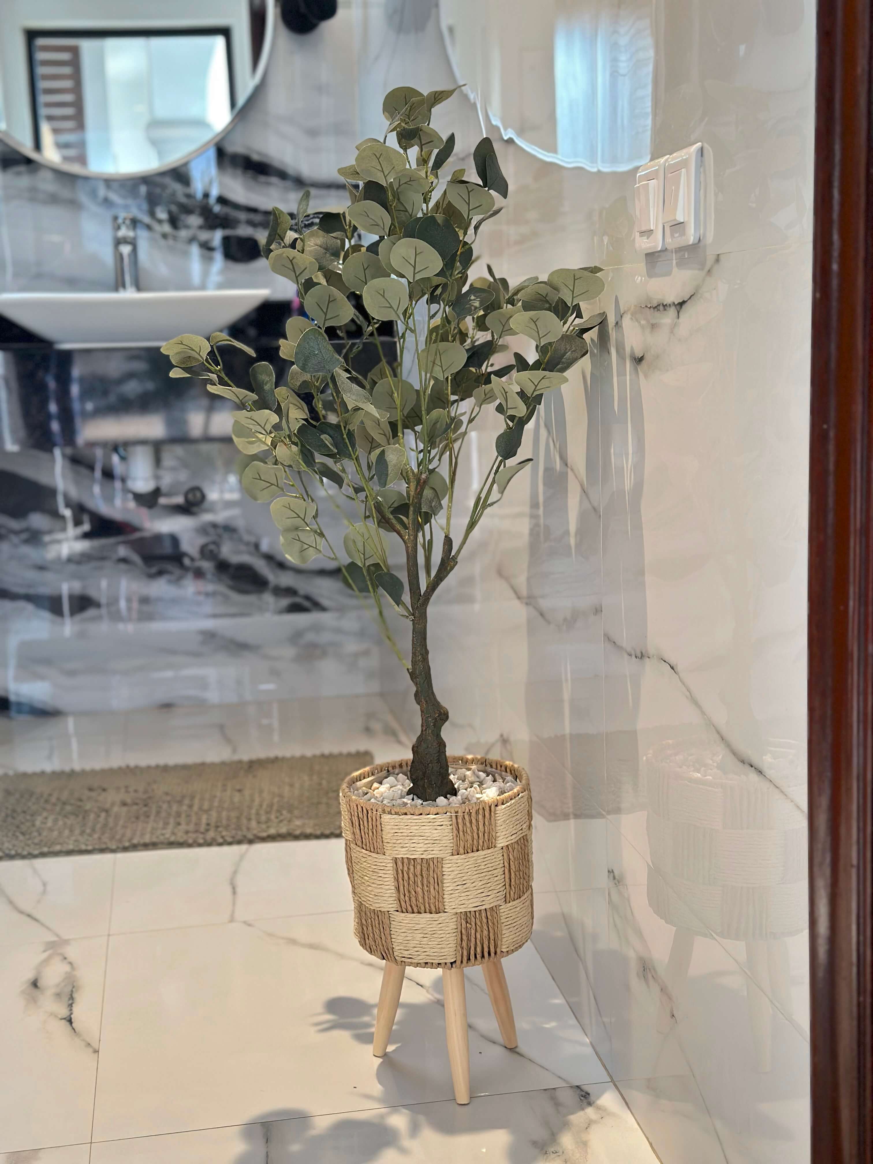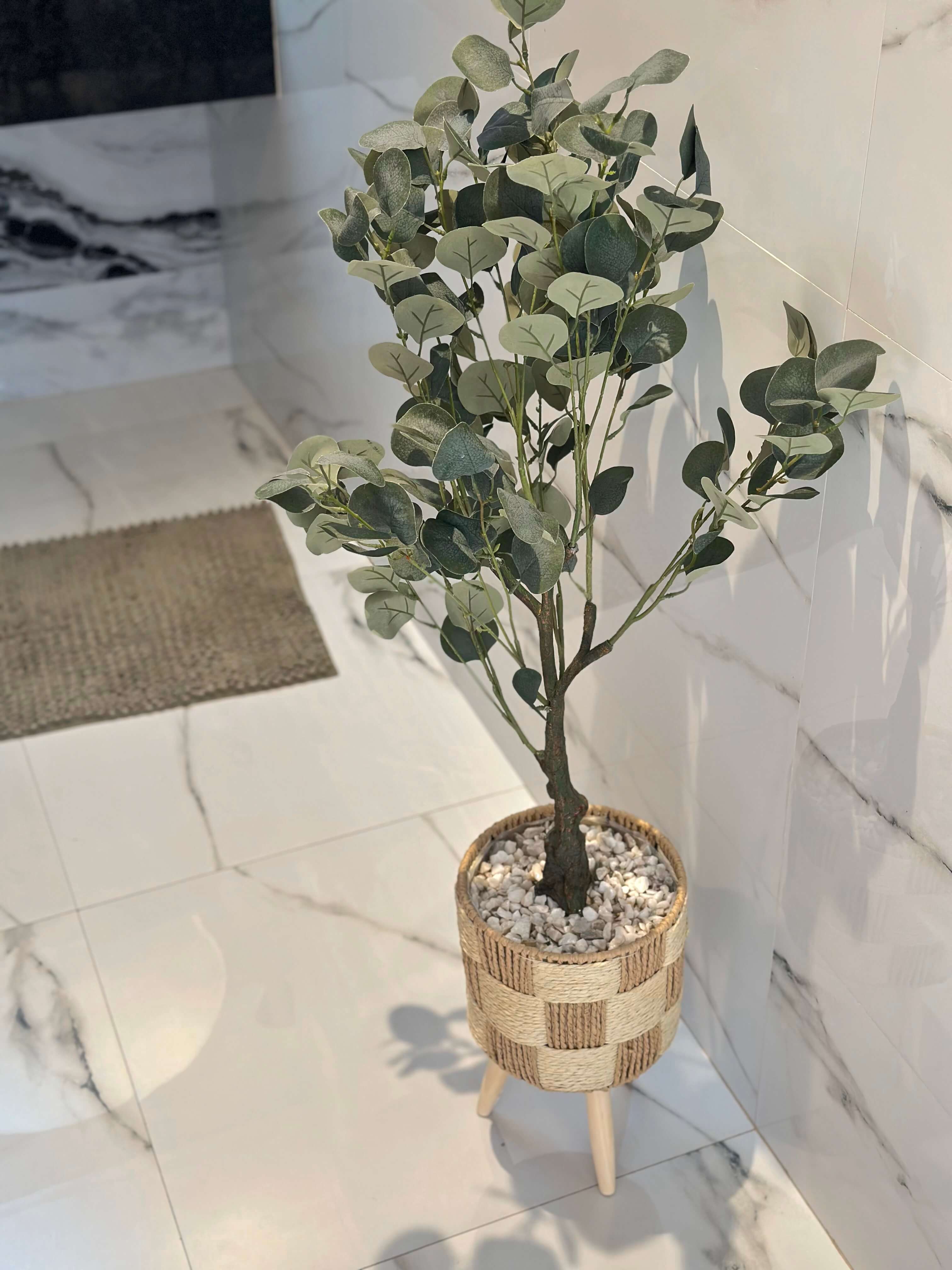 Présenté dans un pot tressé sur pieds, décoré de galets blancs, cet eucalyptus s’intègre parfaitement aux intérieurs contemporains, bohèmes ou minimalistes. Sans entretien, il garde son aspect impeccable au fil des saisons.