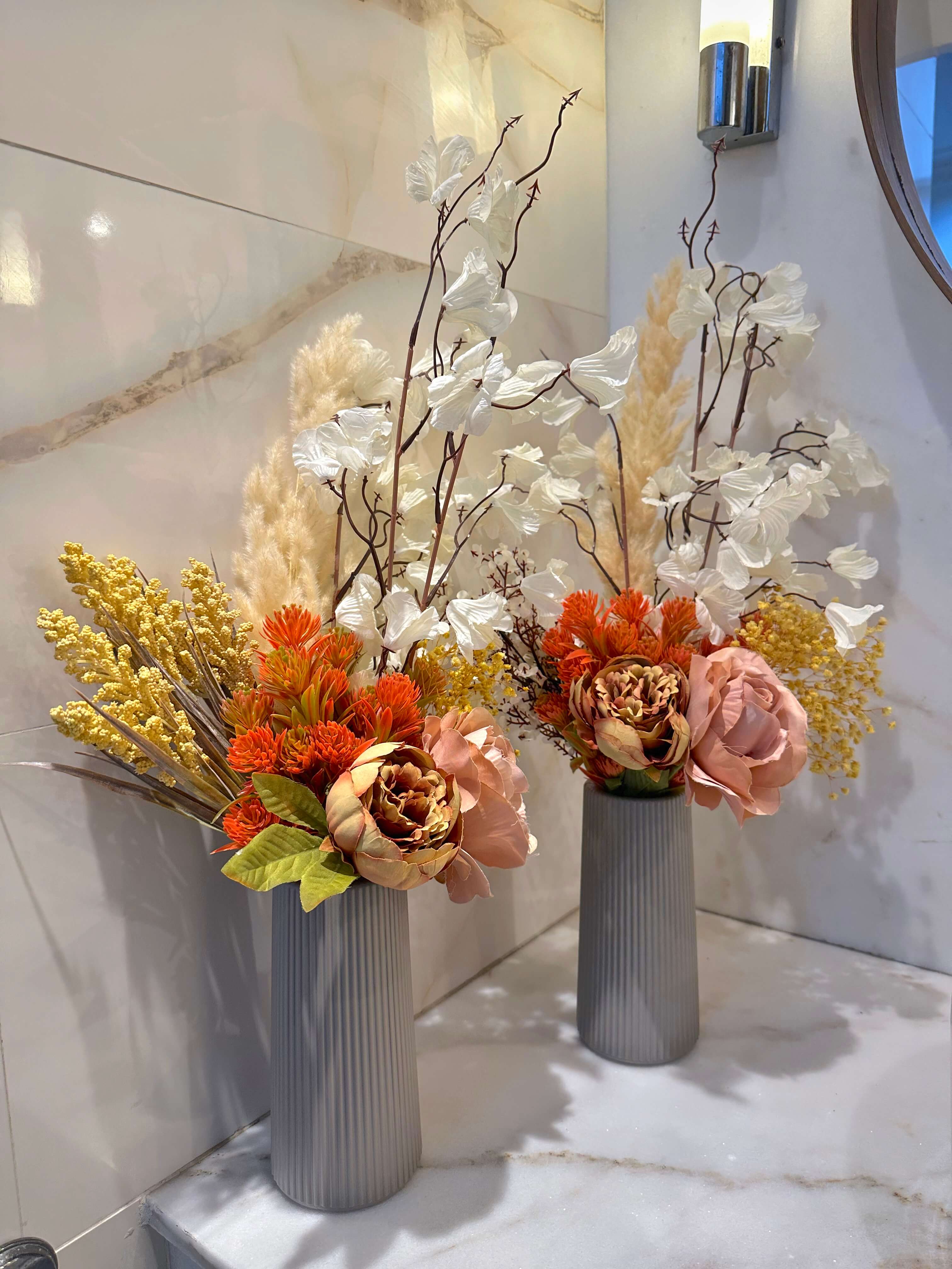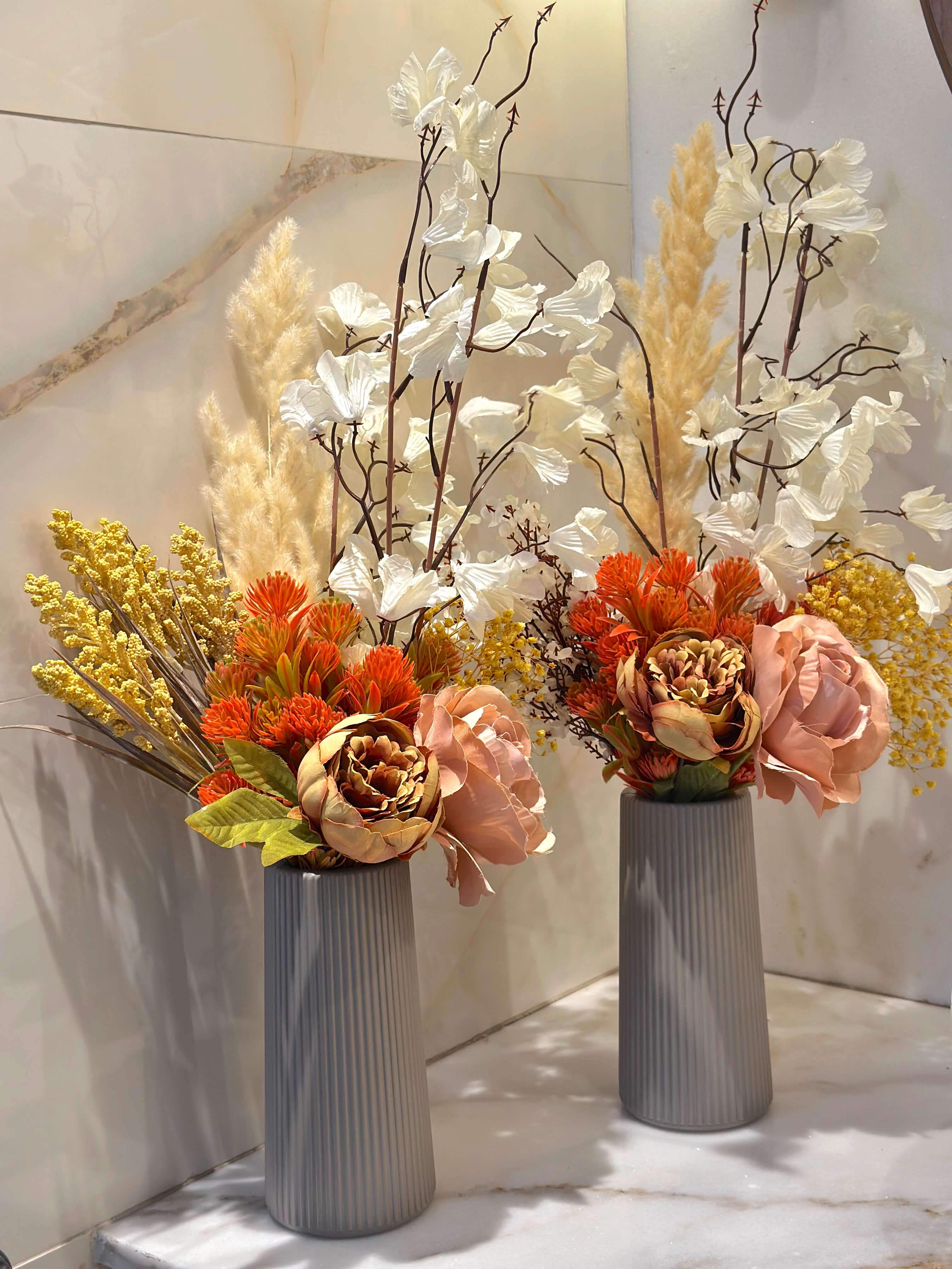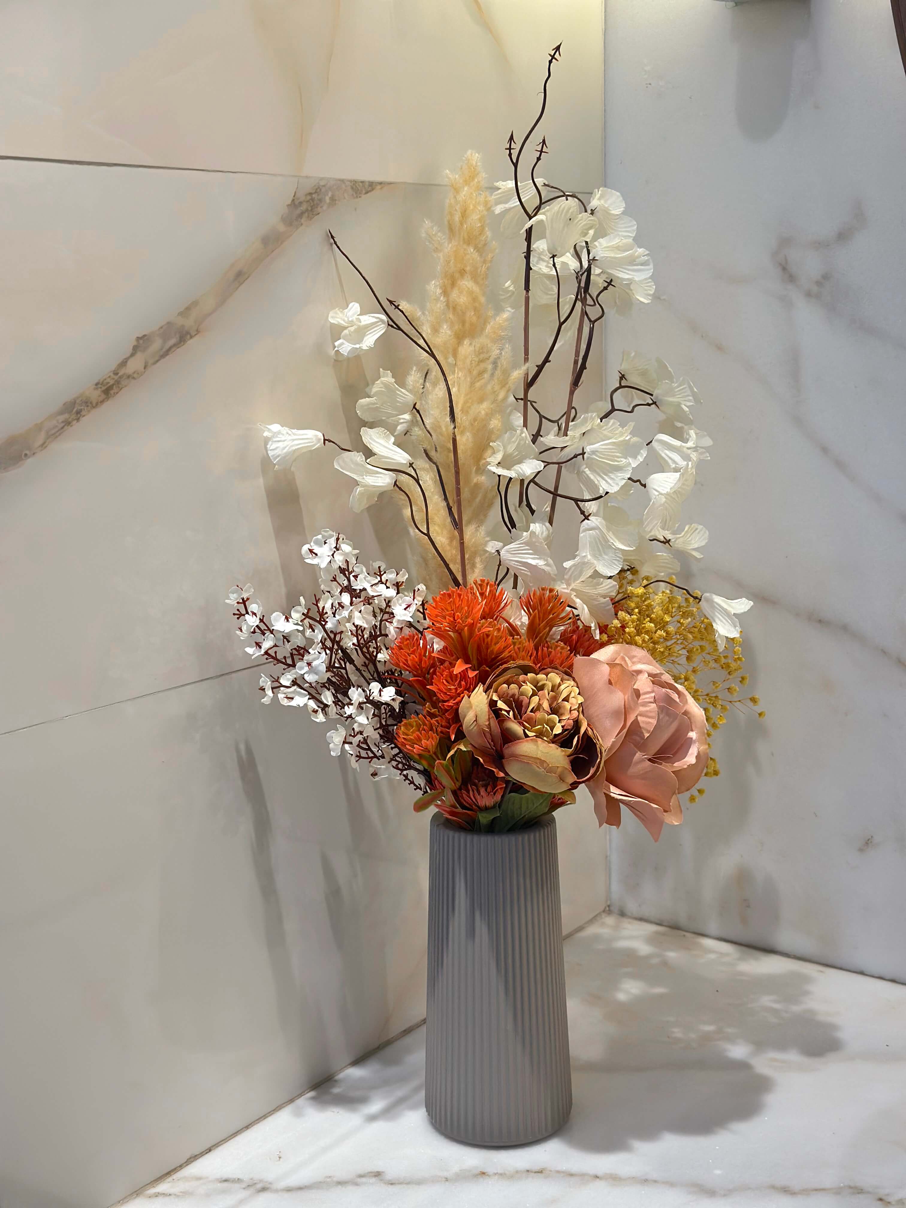 Présentée dans un vase gris moderne et épuré, cette création associe fleurs décoratives, branches fines et pampas pour créer un arrangement équilibré et sophistiqué. Parfaite pour sublimer une console, une table ou un coin du salon, elle apporte instantanément une ambiance chaleureuse et chic.