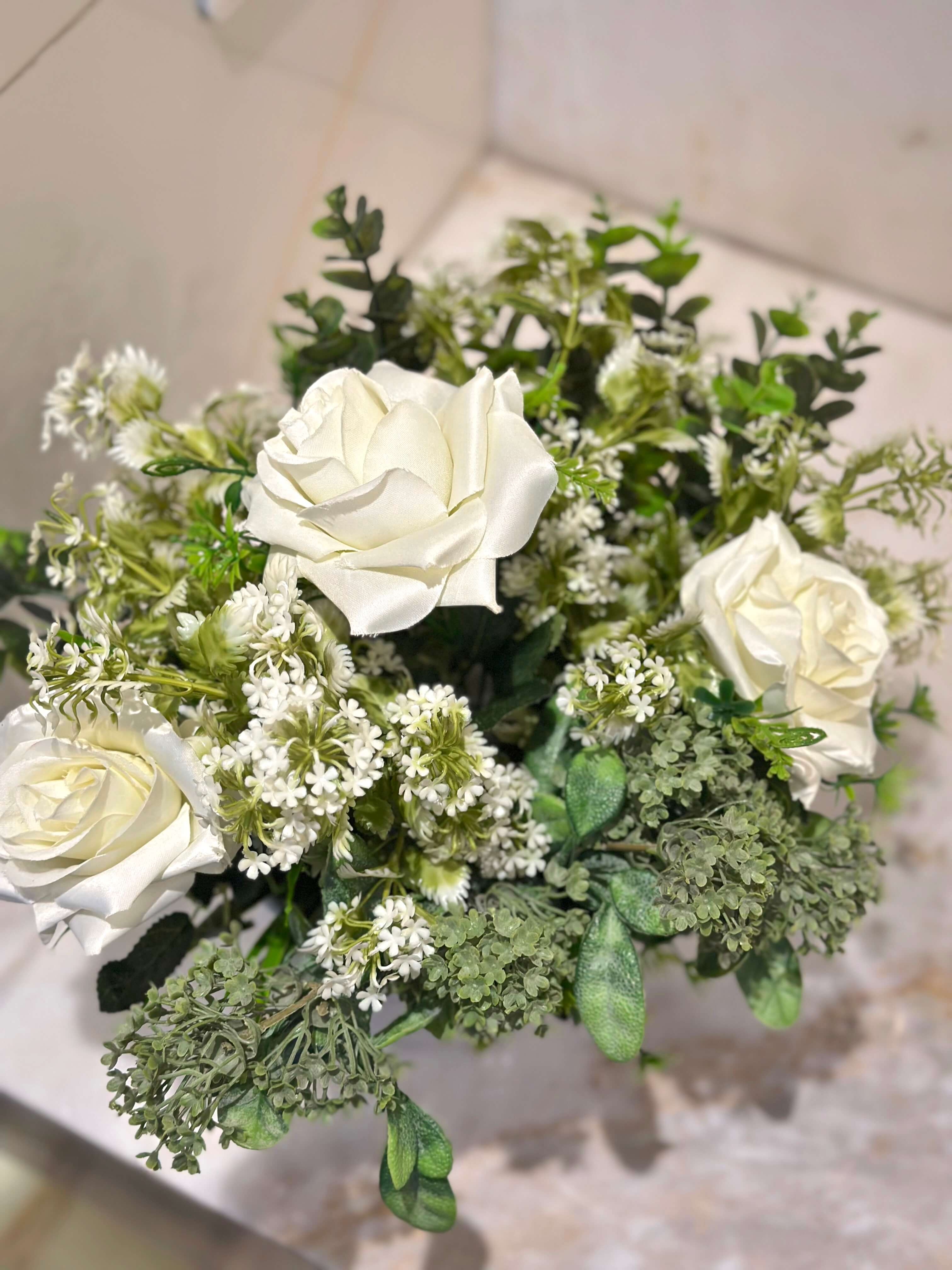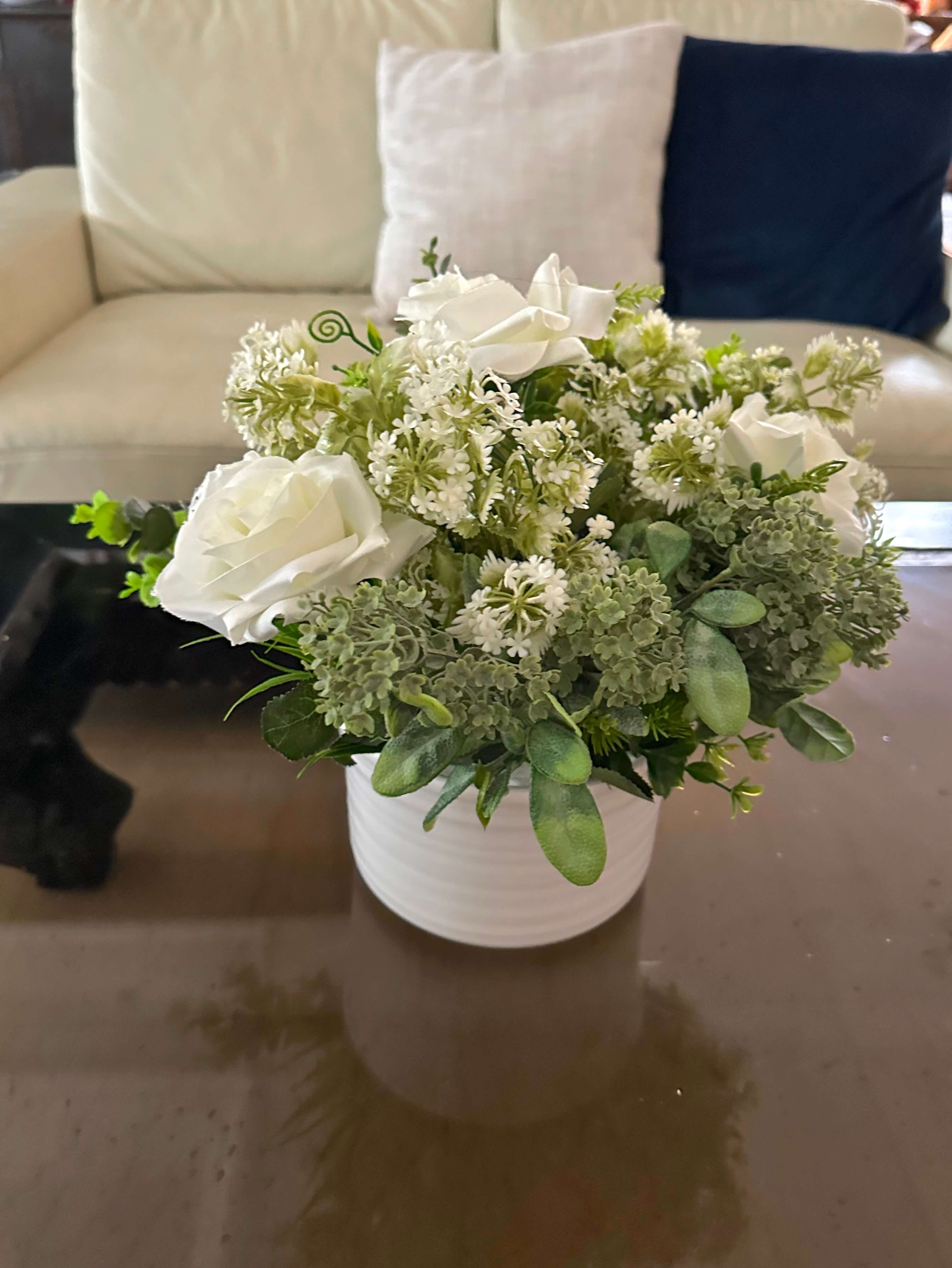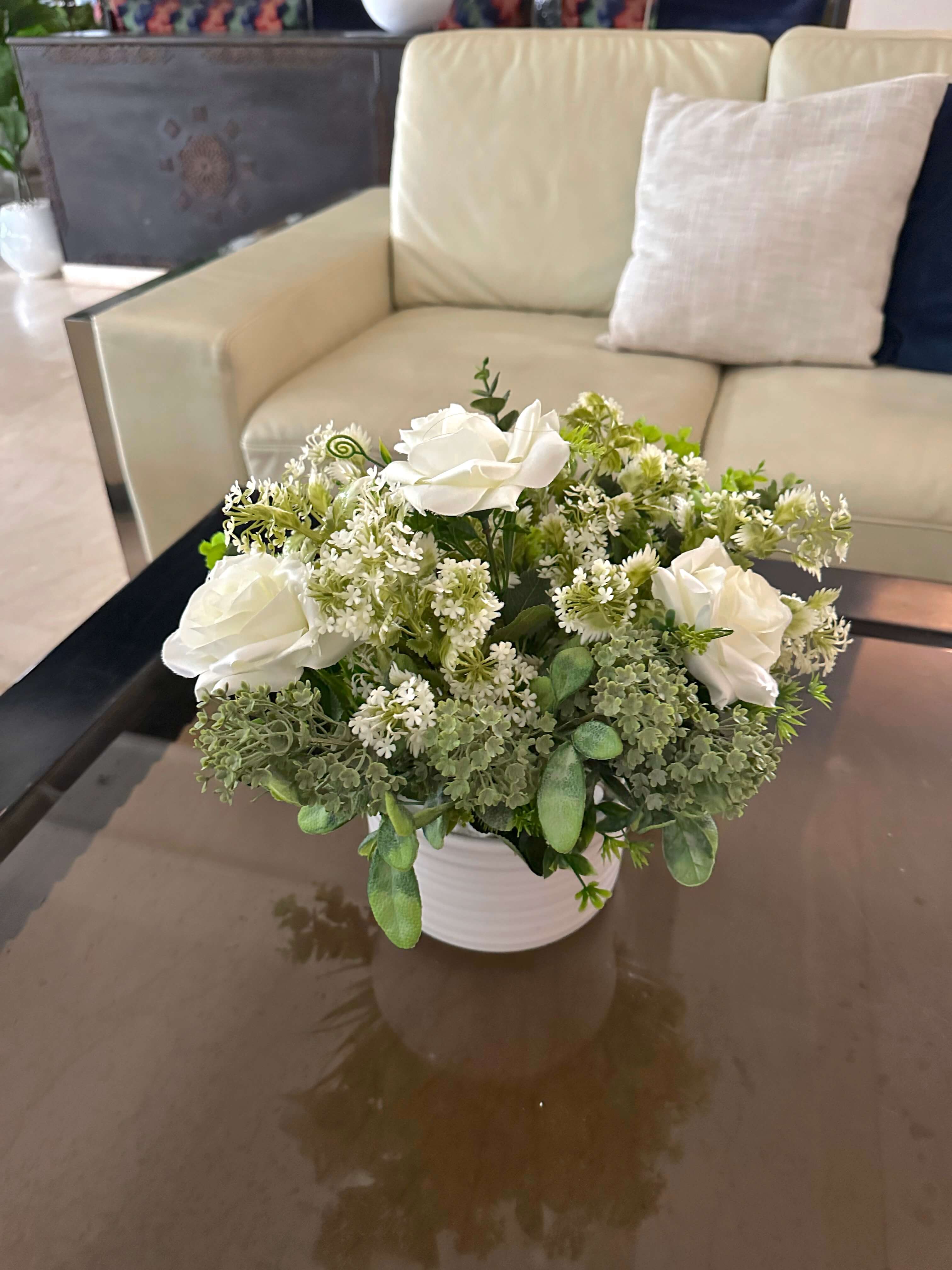 Apportez une touche de fraîcheur et de raffinement à votre intérieur avec Aura Naturelle , un centre de table délicat composé de roses blanches et d’un feuillage vert naturel. Cette composition harmonieuse crée une ambiance douce et apaisante, parfaite pour sublimer une table de salon, une table à manger ou une console.