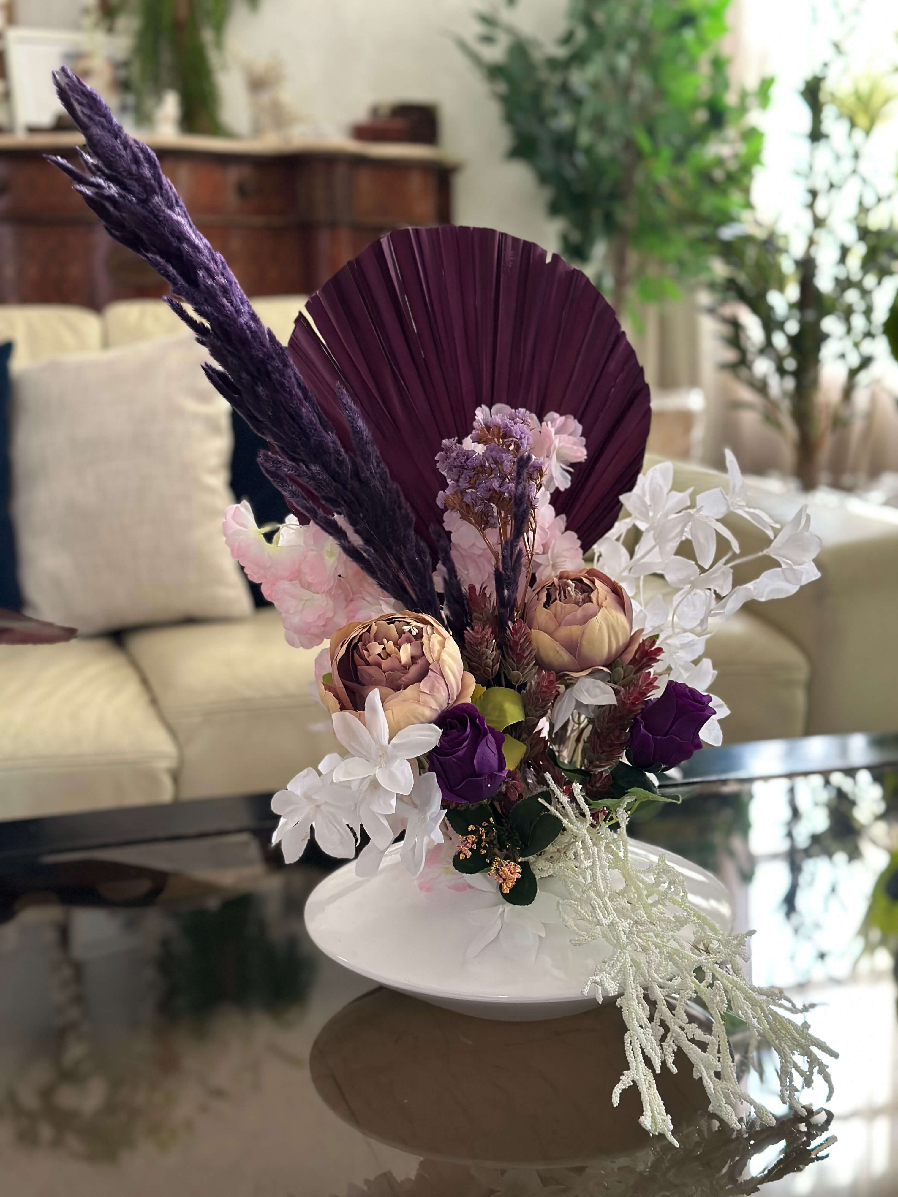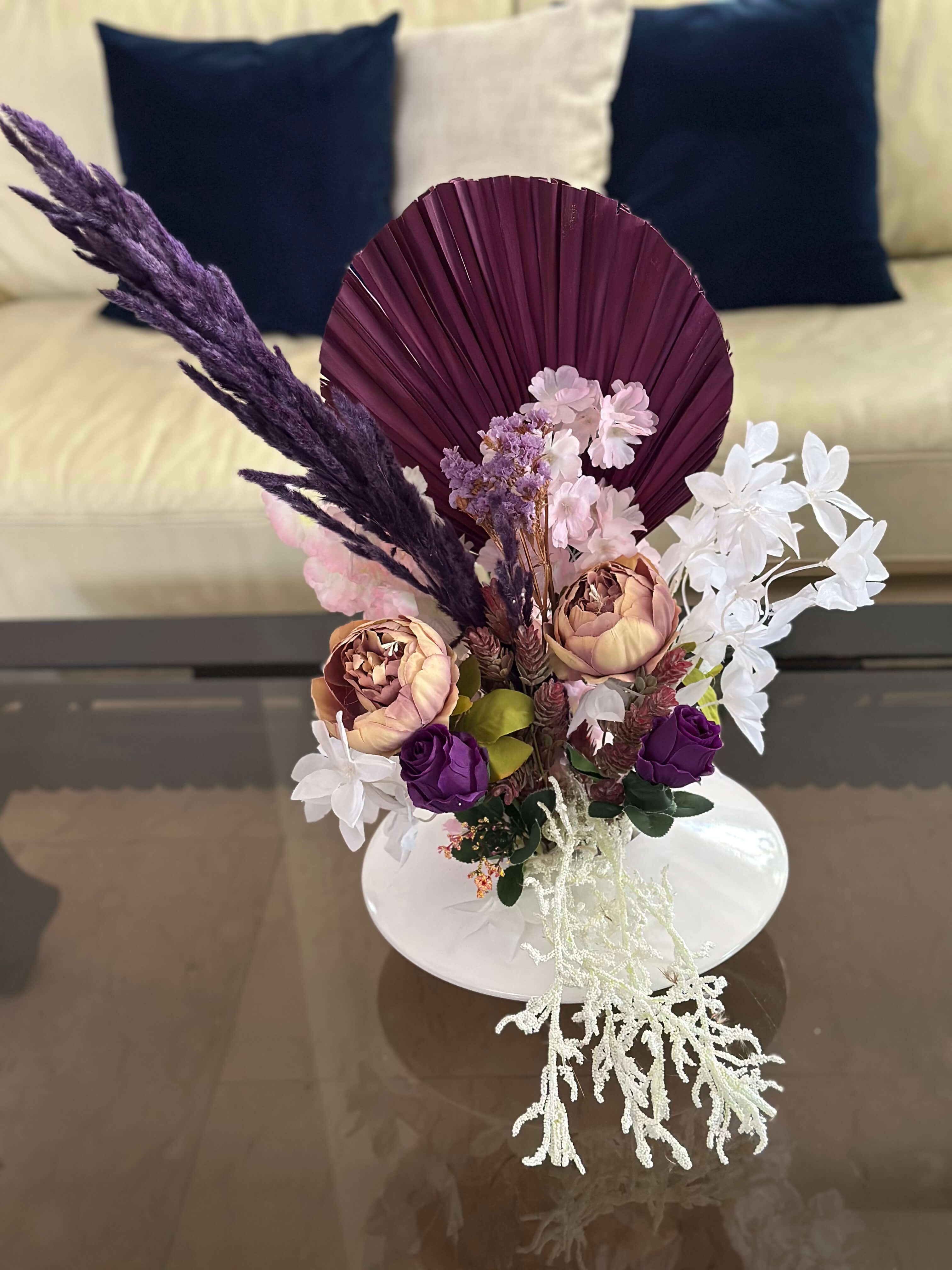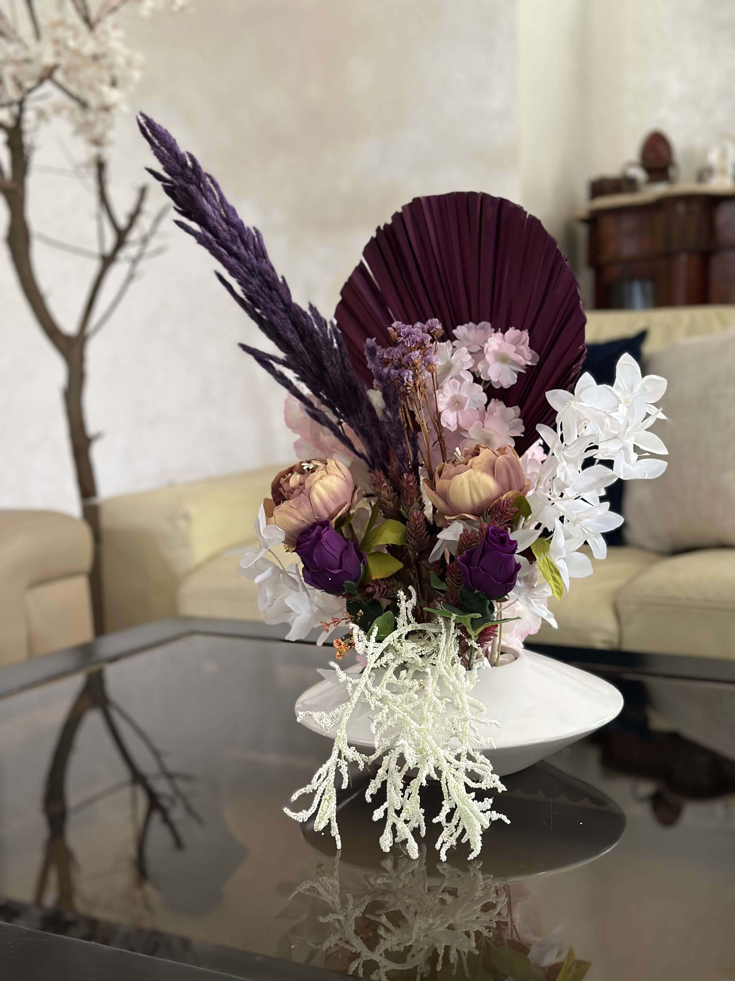 Une composition florale sophistiquée aux nuances prune, nude et blanc, pensée pour apporter une touche chic et contemporaine à votre intérieur. Installée dans un contenant blanc au design moderne, Velours Prune associe textures délicates, fleurs raffinées et feuillages travaillés pour un rendu visuel harmonieux et tendance.