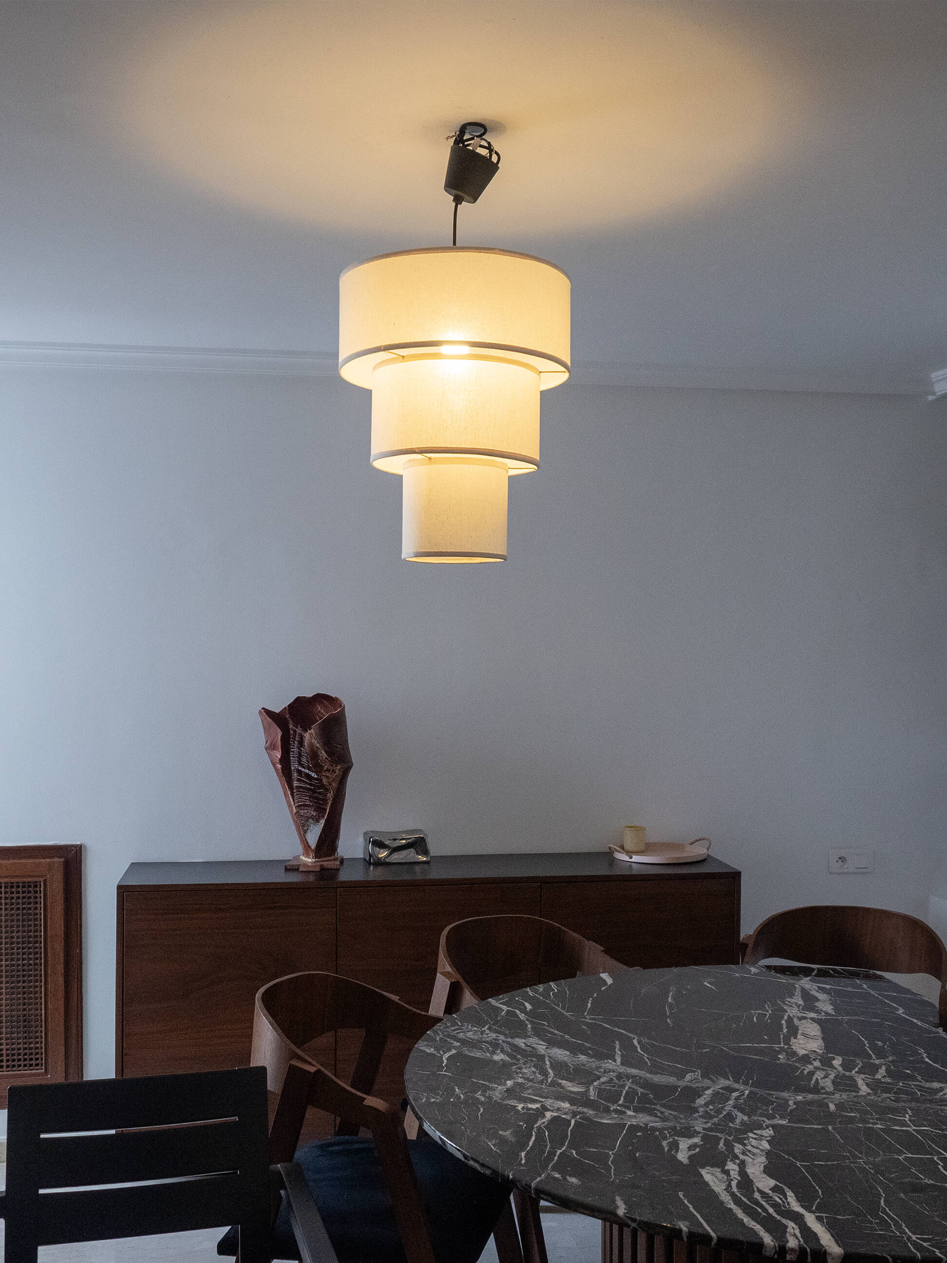 La suspension Lunaria séduit par sa silhouette graphique et douce à la fois. Composée de trois abat-jours décalés en tissu écru, elle diffuse une lumière tamisée qui crée une ambiance feutrée et apaisante. Son design en cascade, à la fois contemporain et chaleureux, s’intègre parfaitement dans les intérieurs modernes, scandinaves ou naturels.