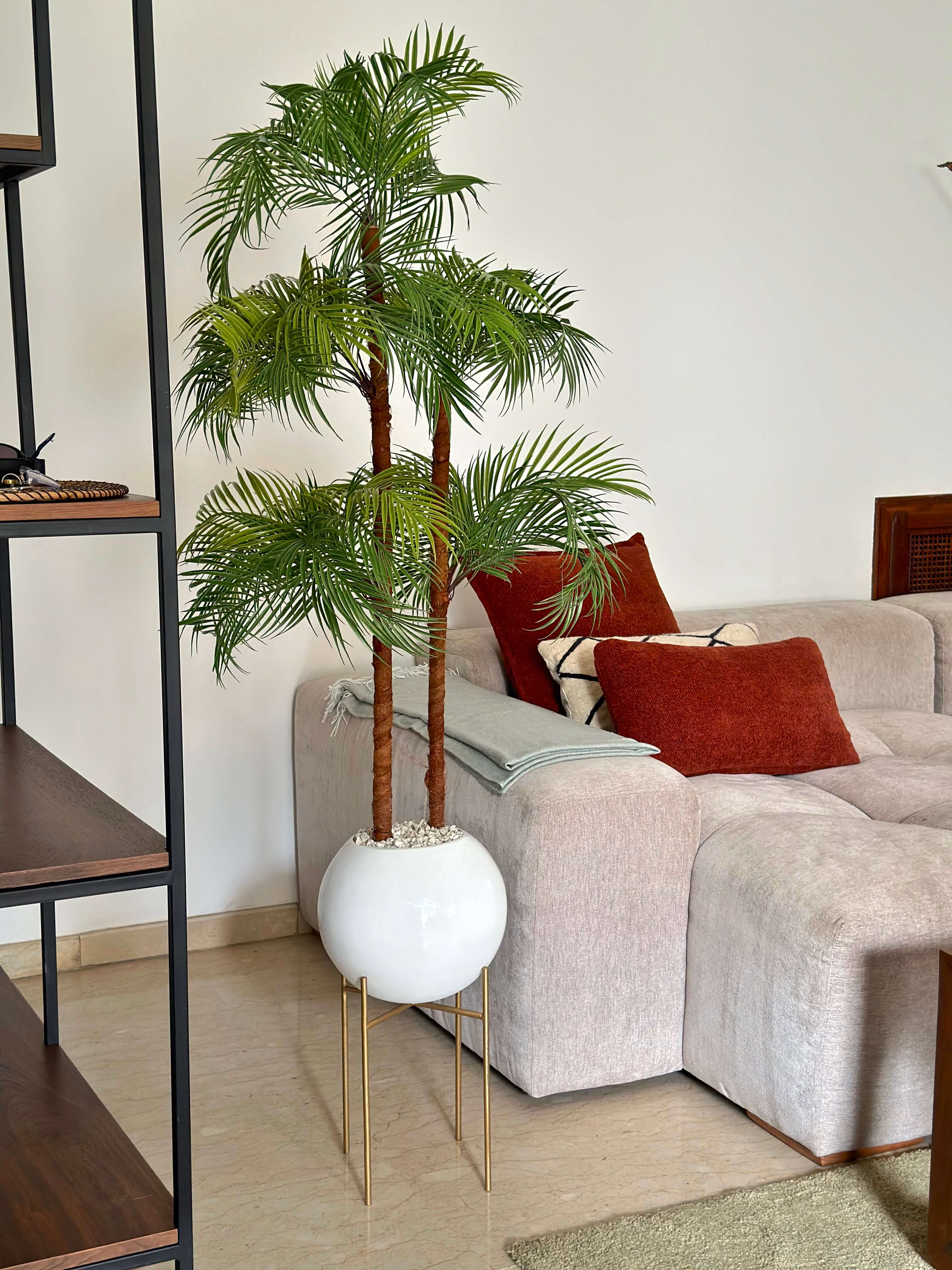 Présenté dans un élégant pot blanc aux lignes douces et sublimé par un support doré ou noir moderne, ce palmier de 1,60 mètre (ou 170 cm avec support) s’adapte à tous les styles : minimaliste, bohème ou contemporain. Il devient la pièce maîtresse de votre salon, bureau ou coin lecture — sans jamais exiger d’entretien.