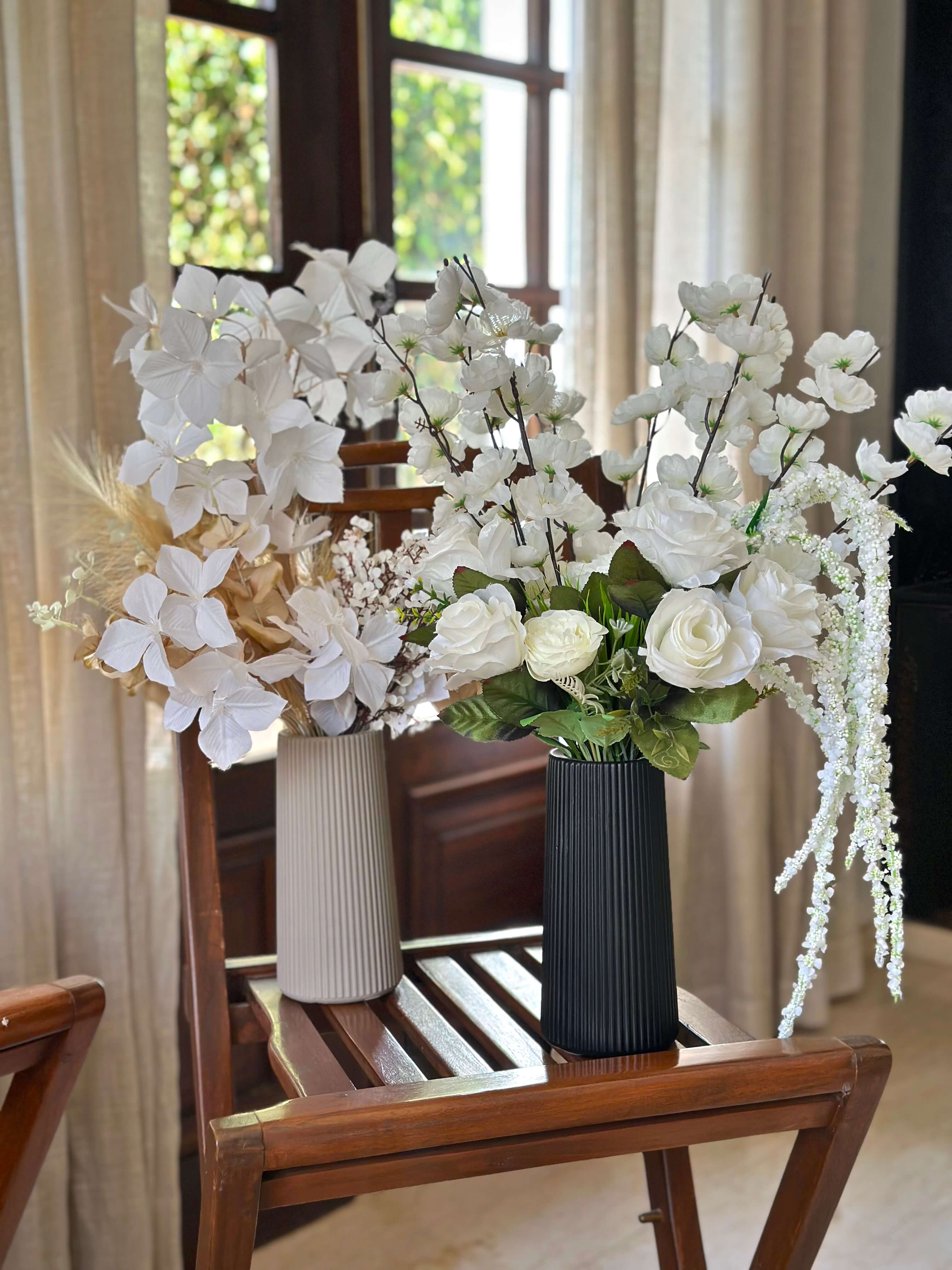 Un bouquet intemporel aux fleurs blanches éclatantes, mariant la finesse des orchidées à la douceur des roses et des rameaux retombants. Le tout est sublimé par un vase noir mat à rainures verticales, qui souligne le contraste entre pureté et modernité. Parfait pour apporter une touche chic et apaisante à votre intérieur, sur une console, une table basse ou un coin lecture.