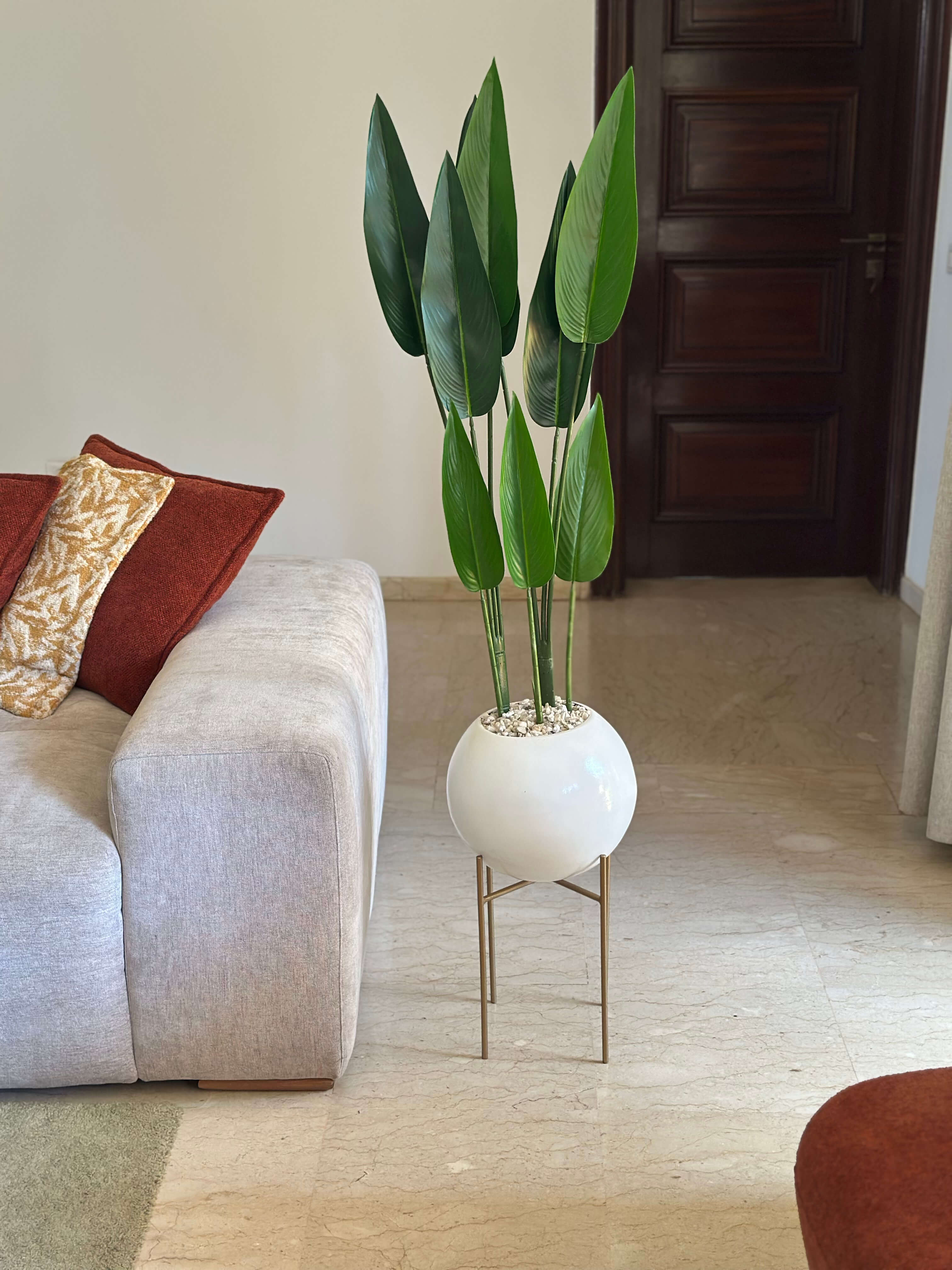 Placée dans un pot sphérique blanc laqué, elle apporte une touche de fraîcheur et de verticalité à votre intérieur, sans jamais l’encombrer.