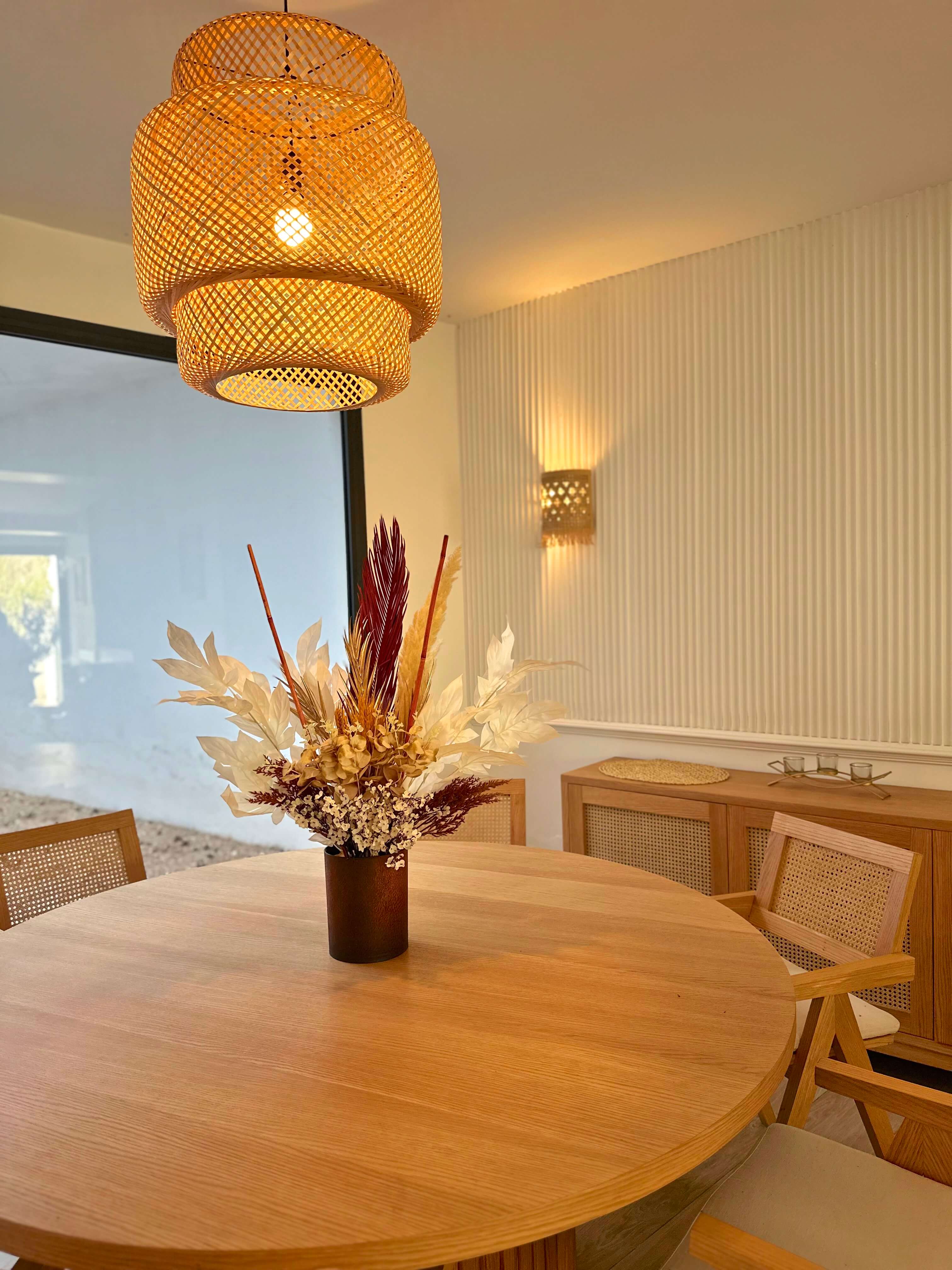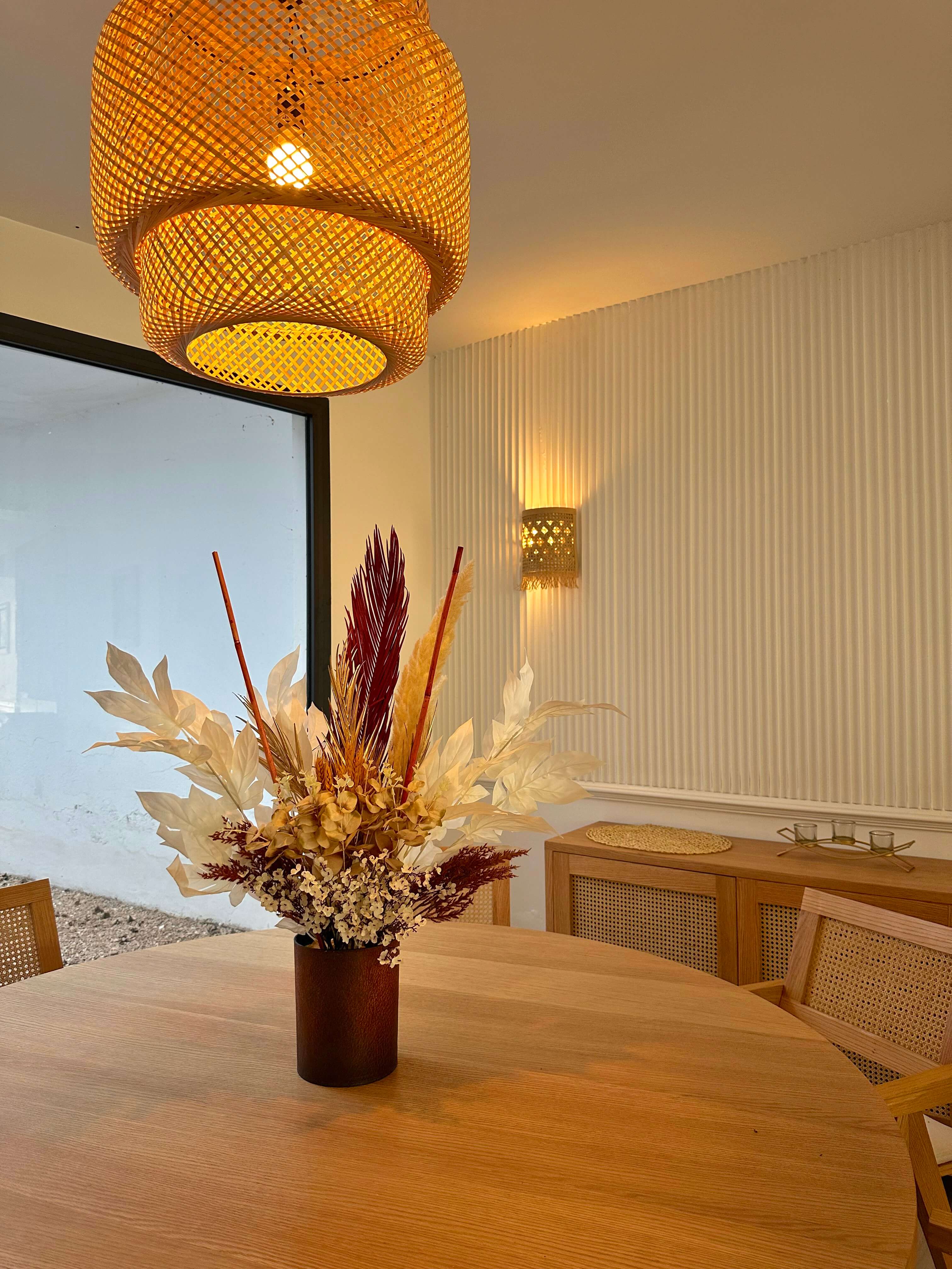 Présentée dans un vase brun texturé, cette composition évoque la force et la chaleur de la nature sauvage, tout en apportant une touche d’élégance et de sérénité à ton intérieur 🍂