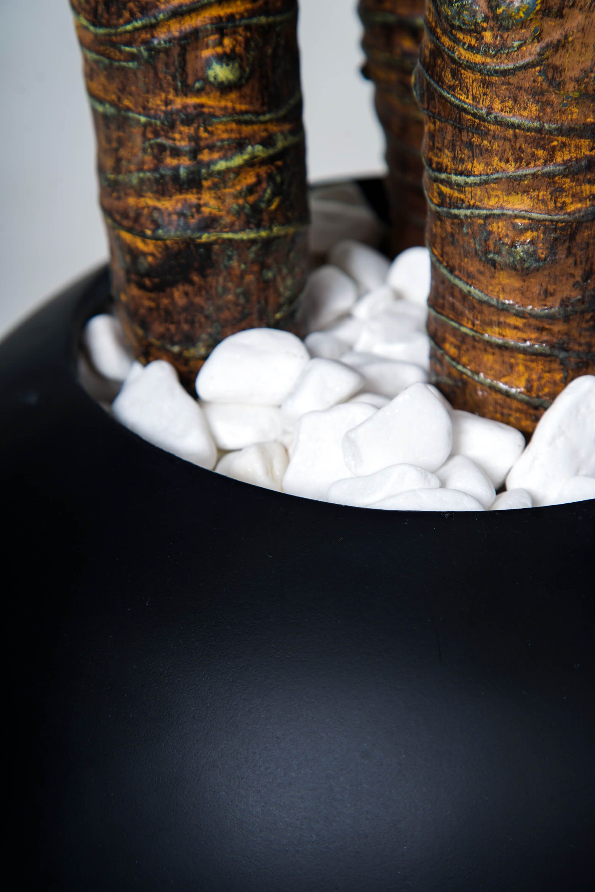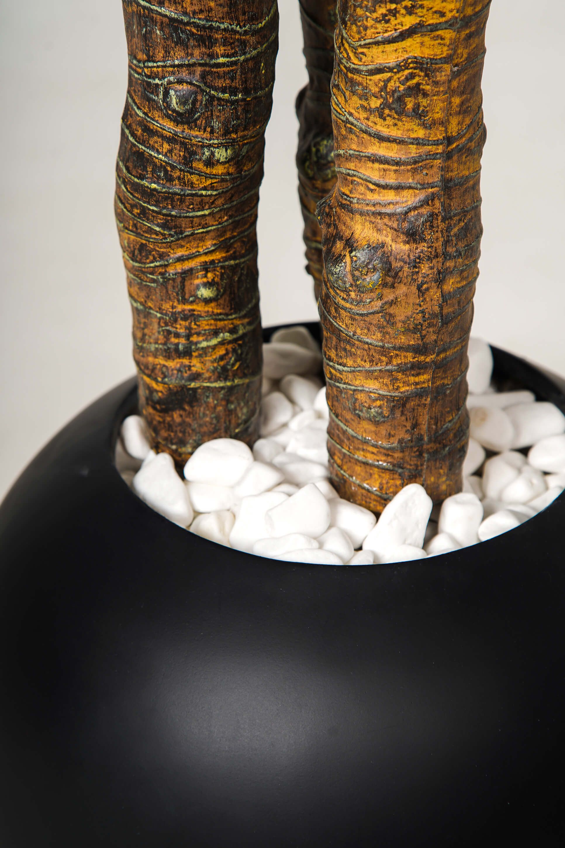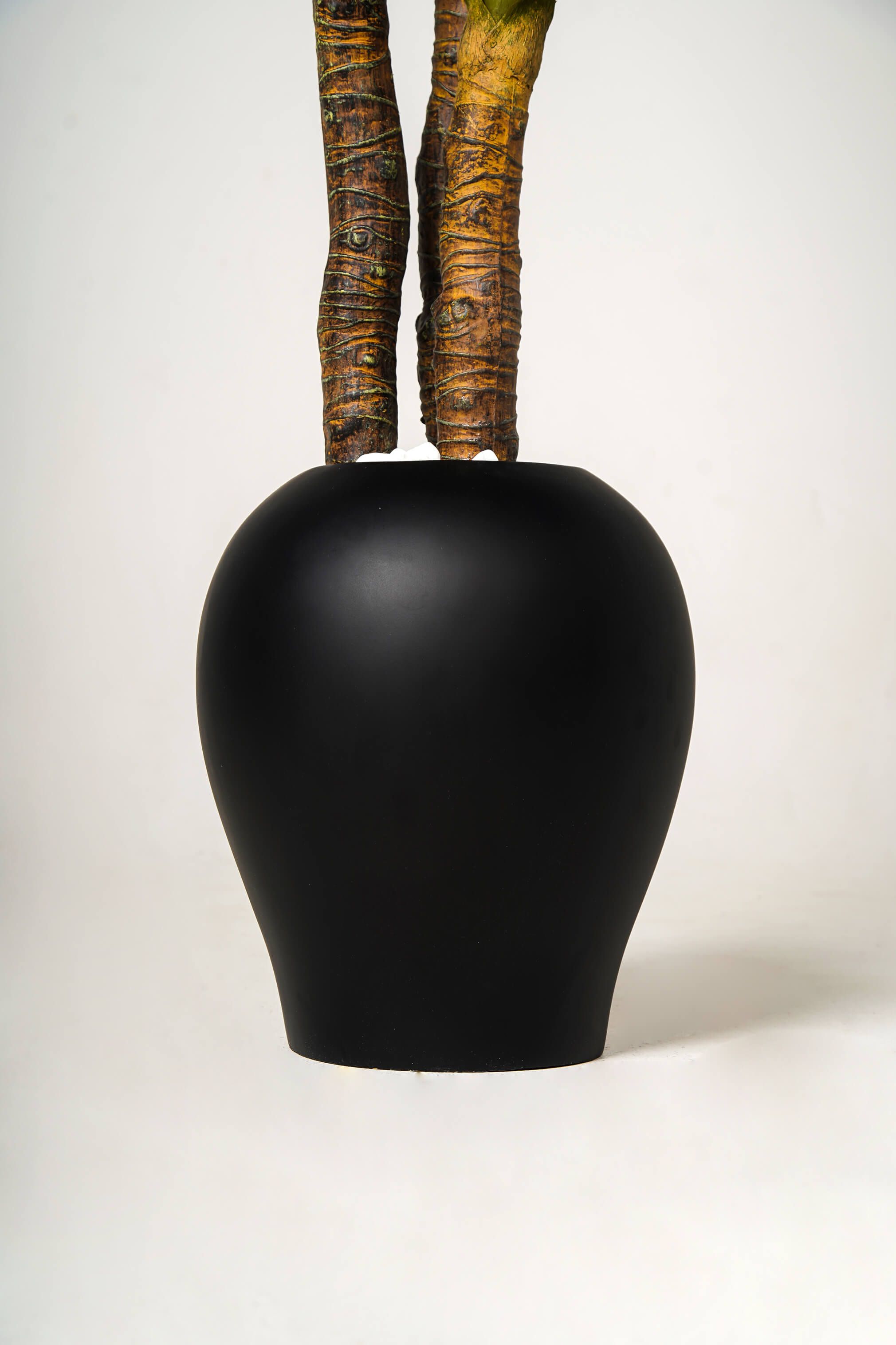 Ses feuilles longues et élancées, au vert profond, créent une silhouette graphique et sophistiquée. Son double tronc naturel renforce son caractère, tandis que le pot noir au design épuré lui donne une allure moderne et chic.